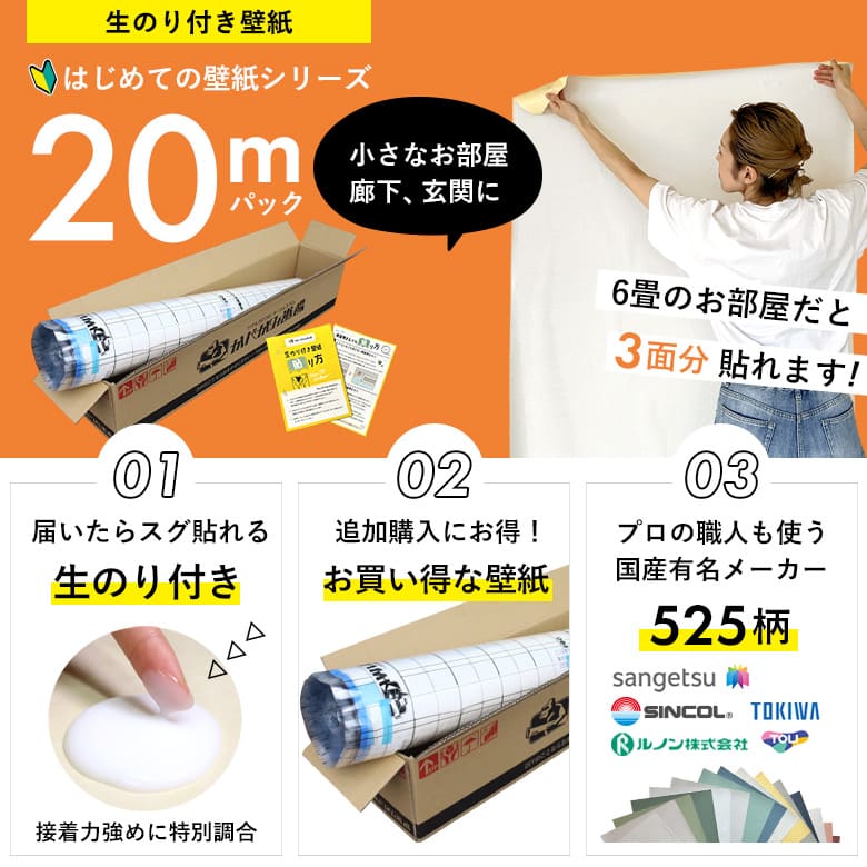「のり付き壁紙だけ 20 mパック」+壁紙張り方マニュアル付き