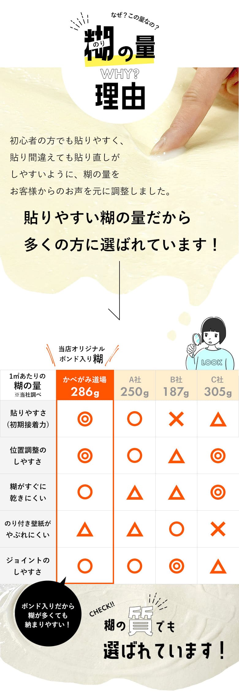 古い壁紙の上から直接貼れるように、接着力を強めに特別調合した生のりを使用。