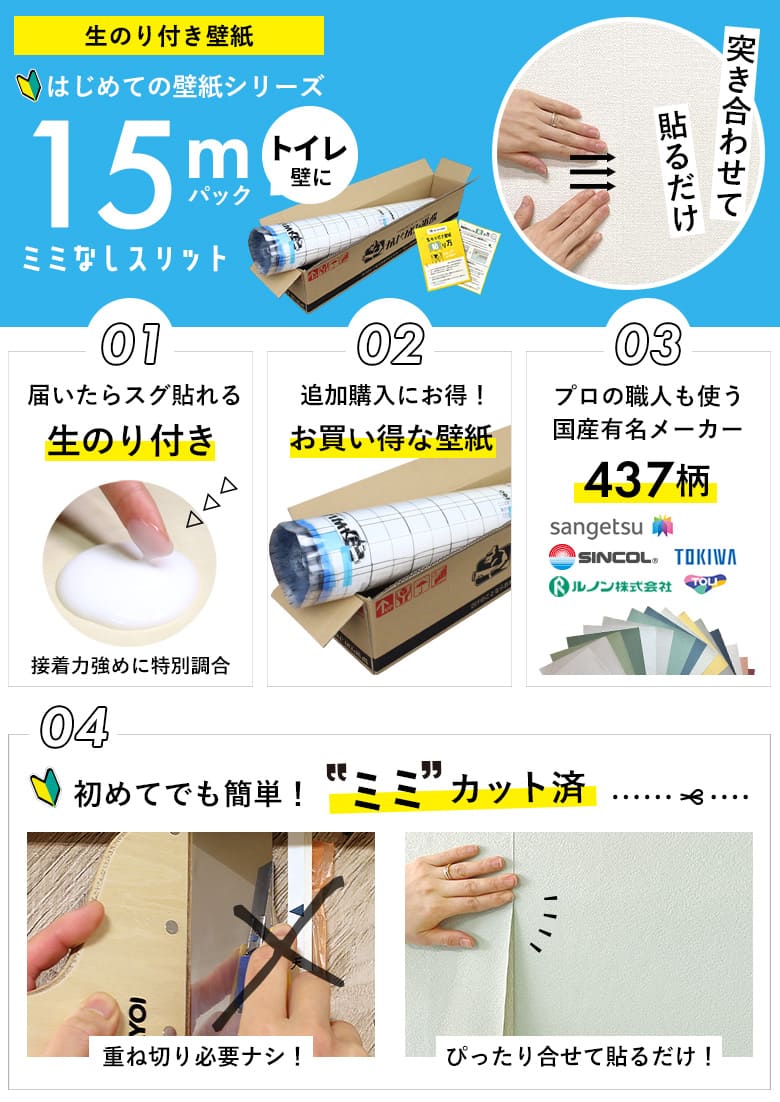スリット壁紙 ミミなし のり付き壁紙 15 mパック+施工説明書