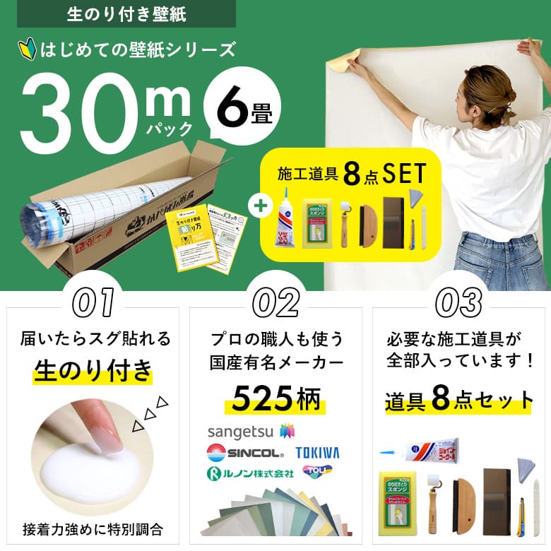 - 壁紙 のりつき 「 一般壁紙 ミミあり 」 はじめての壁紙30m道具セット 選べる525柄 のり付き壁紙 30m+施工道具8点セット+マニュアル