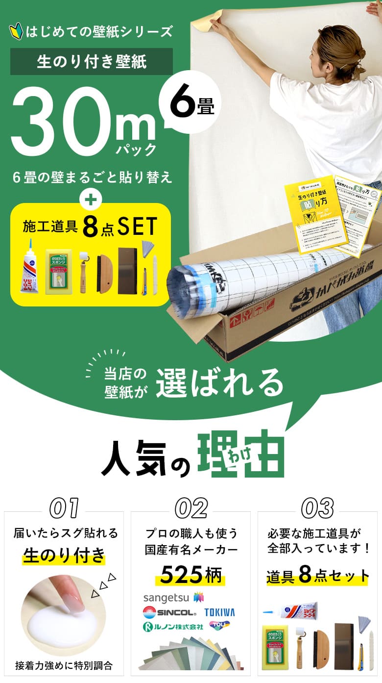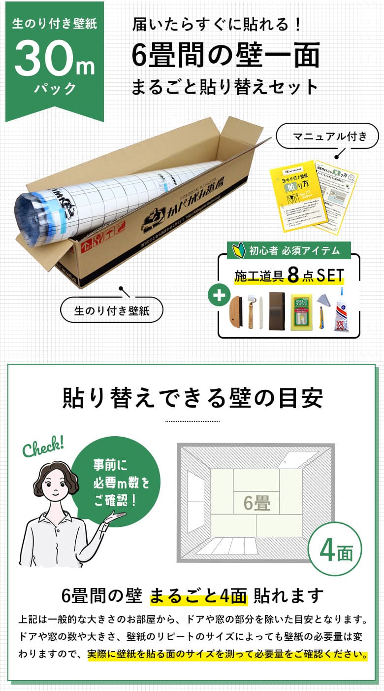 - 生のり付き壁紙6畳分(30m)と詳しい貼り方マニュアル、施工道具一式が付いてフィルムを剥がすだけで初心者でもすぐに張り替え可能。