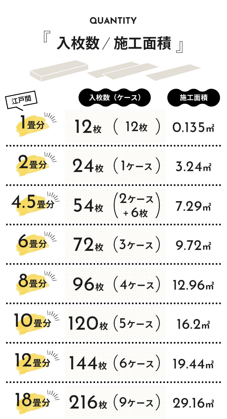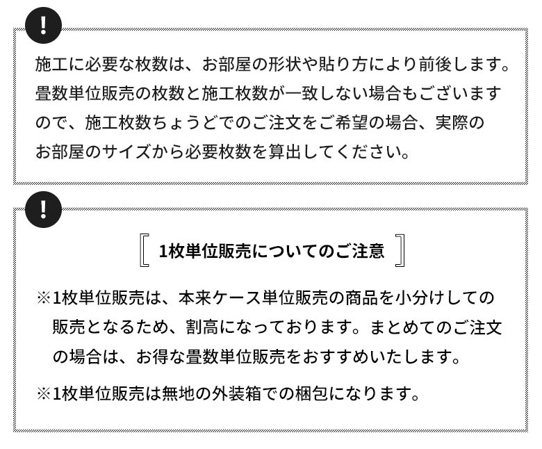 【ご注文単位】サンプル:1枚 / 1枚単位:1枚 / 約1畳分:12枚 / 約2畳分:24枚(1ケース) / 約4.5畳分:54枚(2ケース+6枚) / 約6畳分:72枚(3ケース) / 約8畳分:96枚(4ケース) / 約10畳分:120枚(5ケース) / 約12畳分:144枚(6ケース) / 約18畳分:216枚(9ケース)