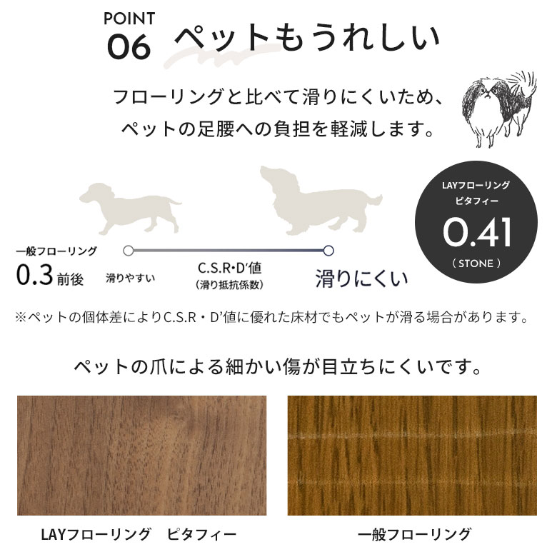 ・フローリングにくらべ滑りにくくキズつきにくいので、わんちゃん・ねこちゃんなどペットのいるお家にもおすすめです。