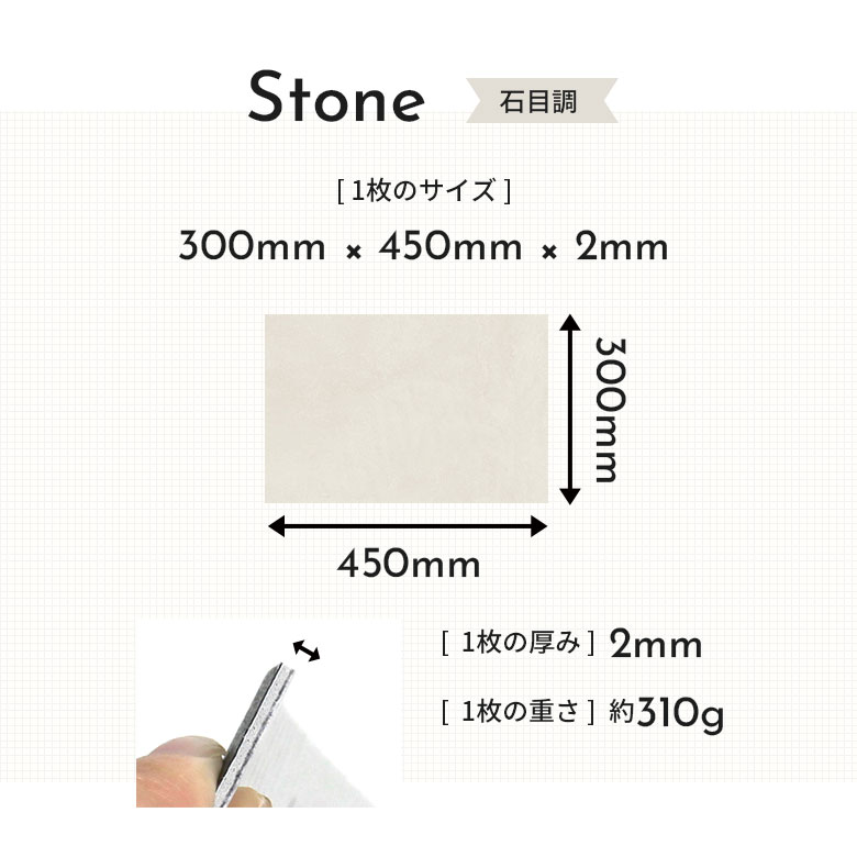・下地の床が3mmより厚いクッションフロアや石材の場合、浮きや剥がれが生じたり、裏面が吸着しない場合があります。
