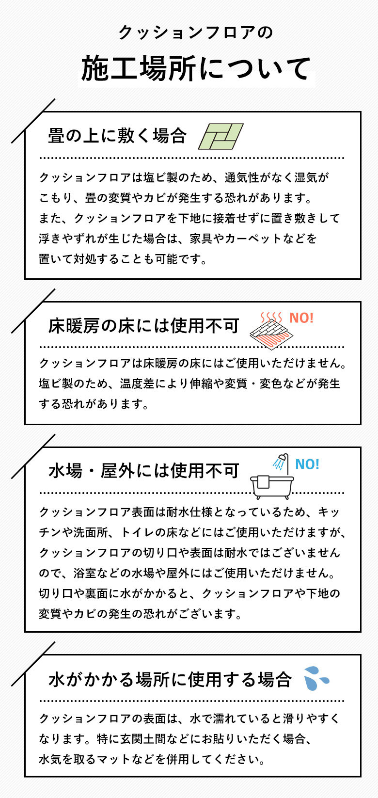 ・表面は耐水性に優れ、お手入れもかんたん。 シート形状で継ぎ目が少ないので、 水まわりのほか、お子さまが過ごすスペースなど、液体をこぼしたり、汚れたりしやすい場所にもぴったりです。
