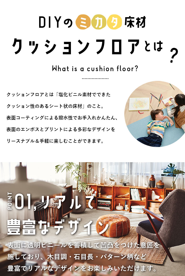 クッションフロアとは、発泡層があるやわらかい質感のビニル床シートです。