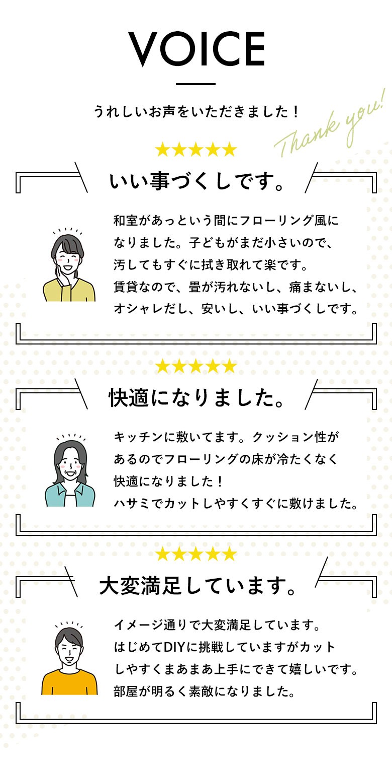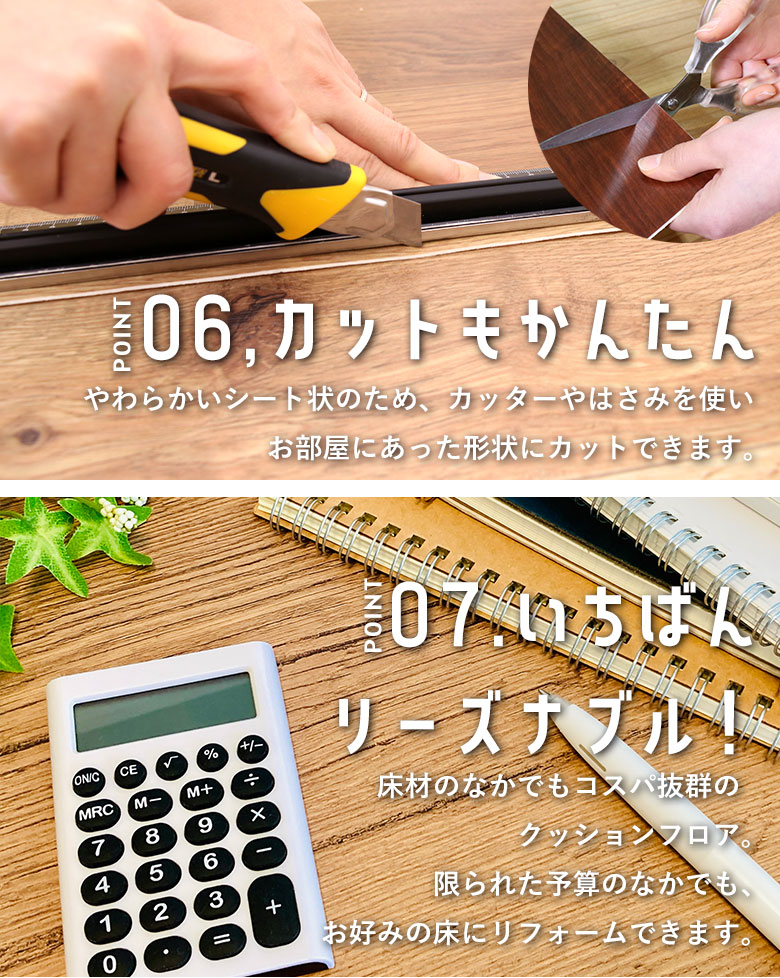 ・他の床材に比べ、優れたコストパフォーマンス。カッターやハサミでもカットでき、施工もしやすいので、新築だけでなくリフォームにも適しています。