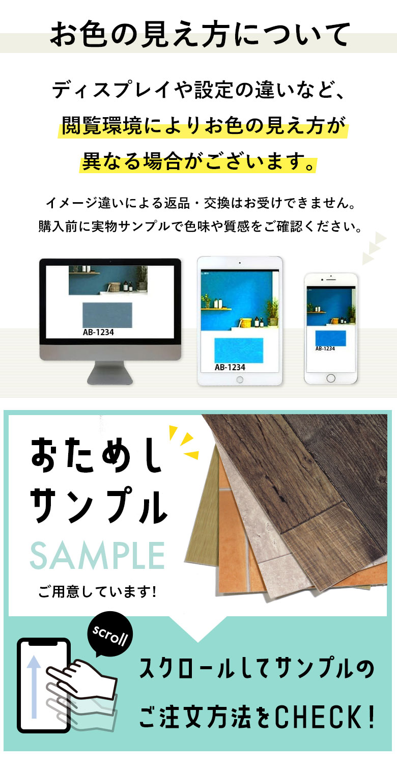 商品の色やイメージ違いでの返品・交換はお受けできません。有料サンプルで実際の色や質感をお確かめください。