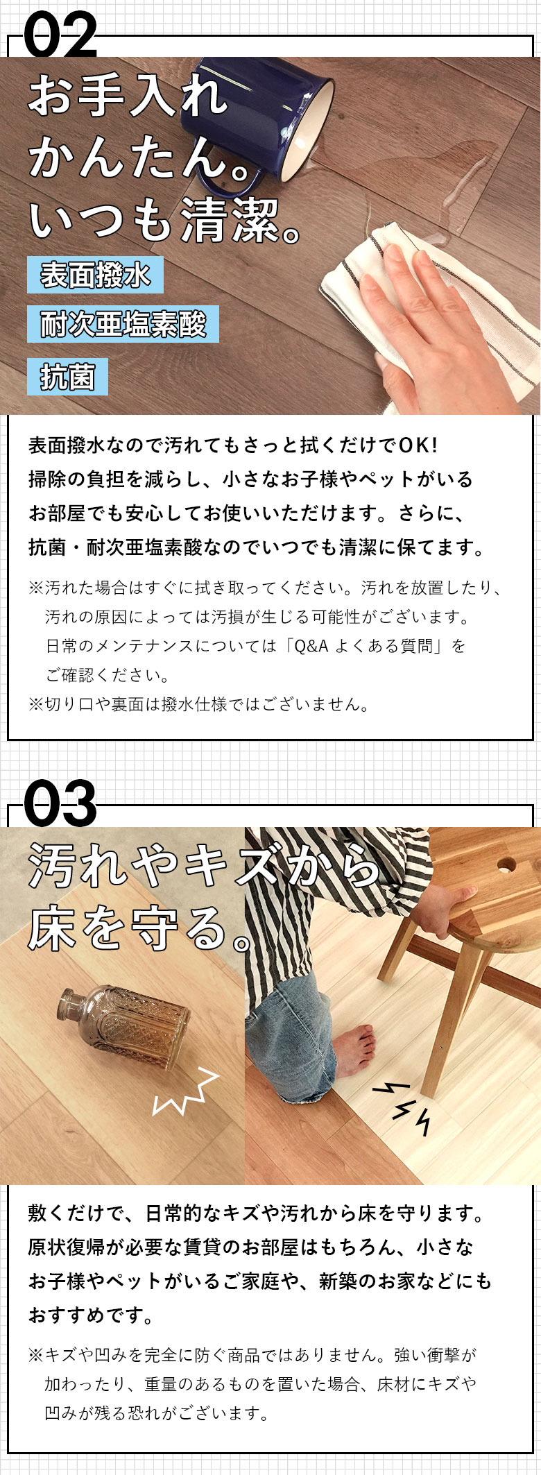 ・水に強く、食べこぼしもサッと拭くだけ。水廻り以外にもリビング、寝室、子供部屋に。