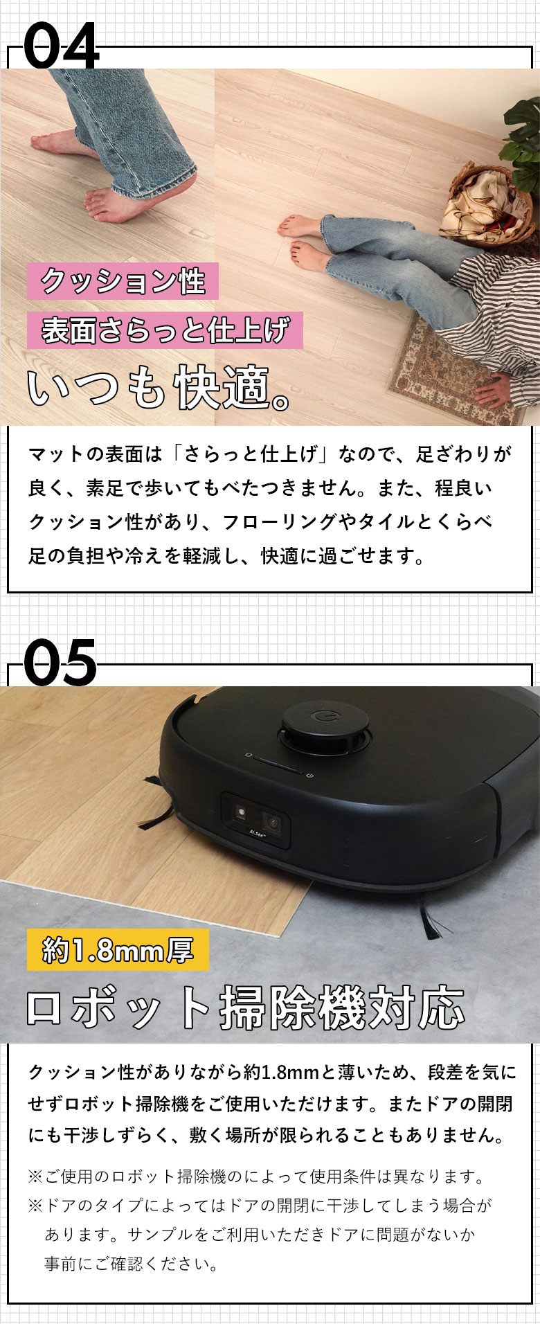 約1.8mm厚の程よいクッション性で足の負担や冷えを軽減し、ロボット掃除機も対応。
