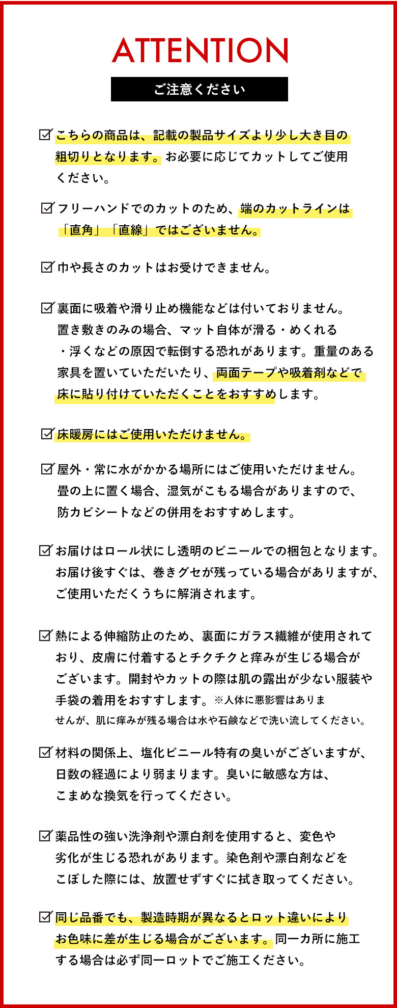 - ワックスを使用する際には、クッションフロア用ワックスをご使用ください。