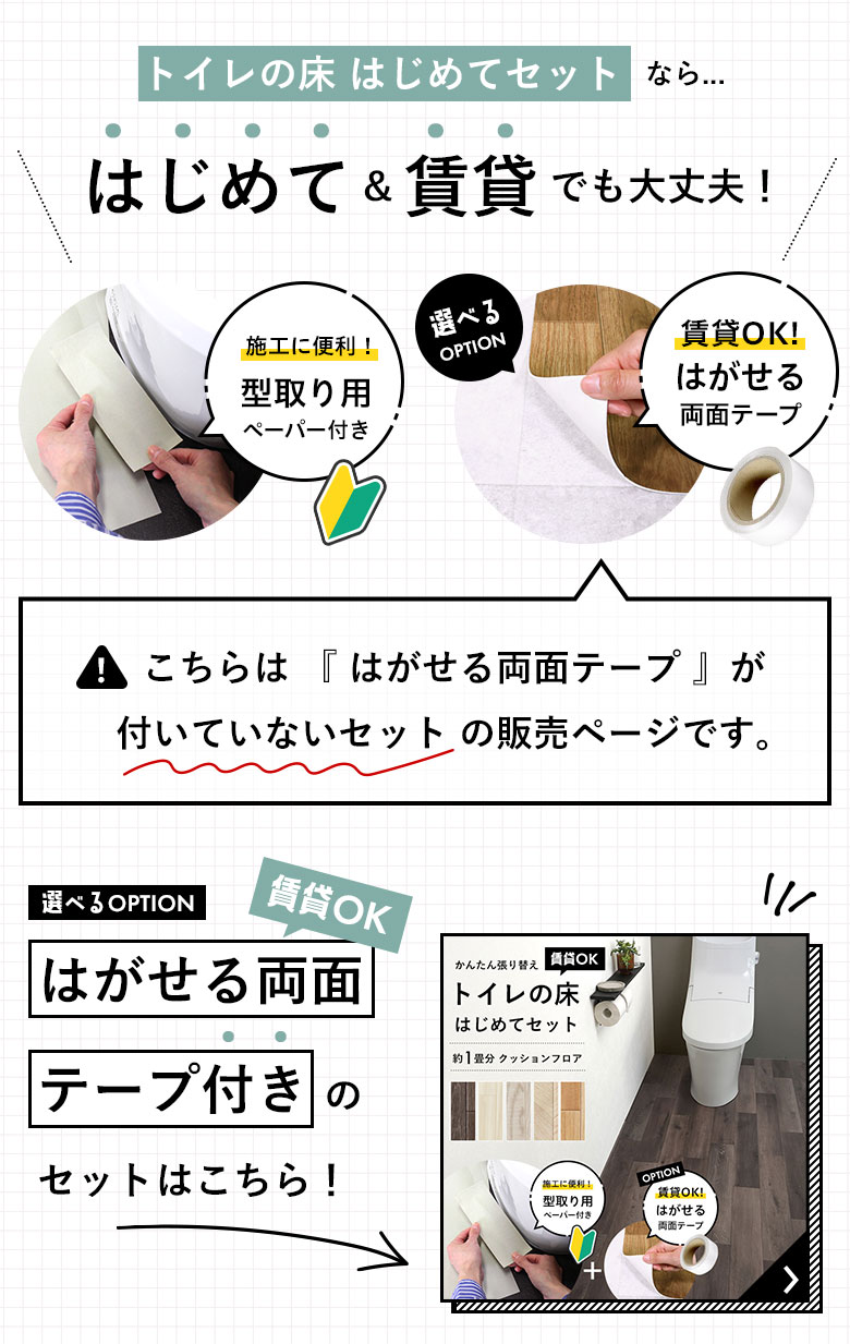 ●「クッションフロア用はがせる両面テープ」使用なら原状復帰が必要な賃貸でもOK!