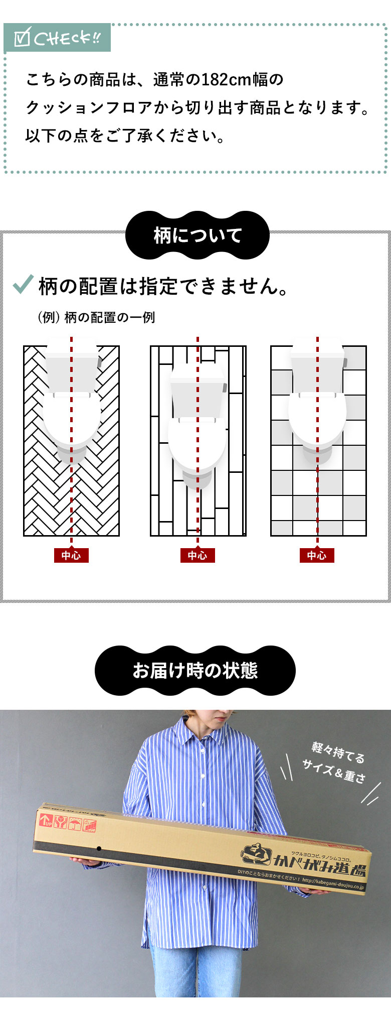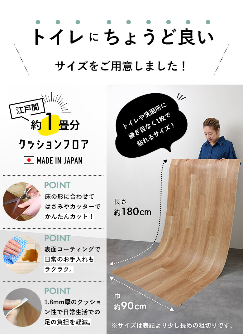 ●一般的によくあるサイズのトイレにちょうど良い、約90cm×約180cmのクッションフロア!