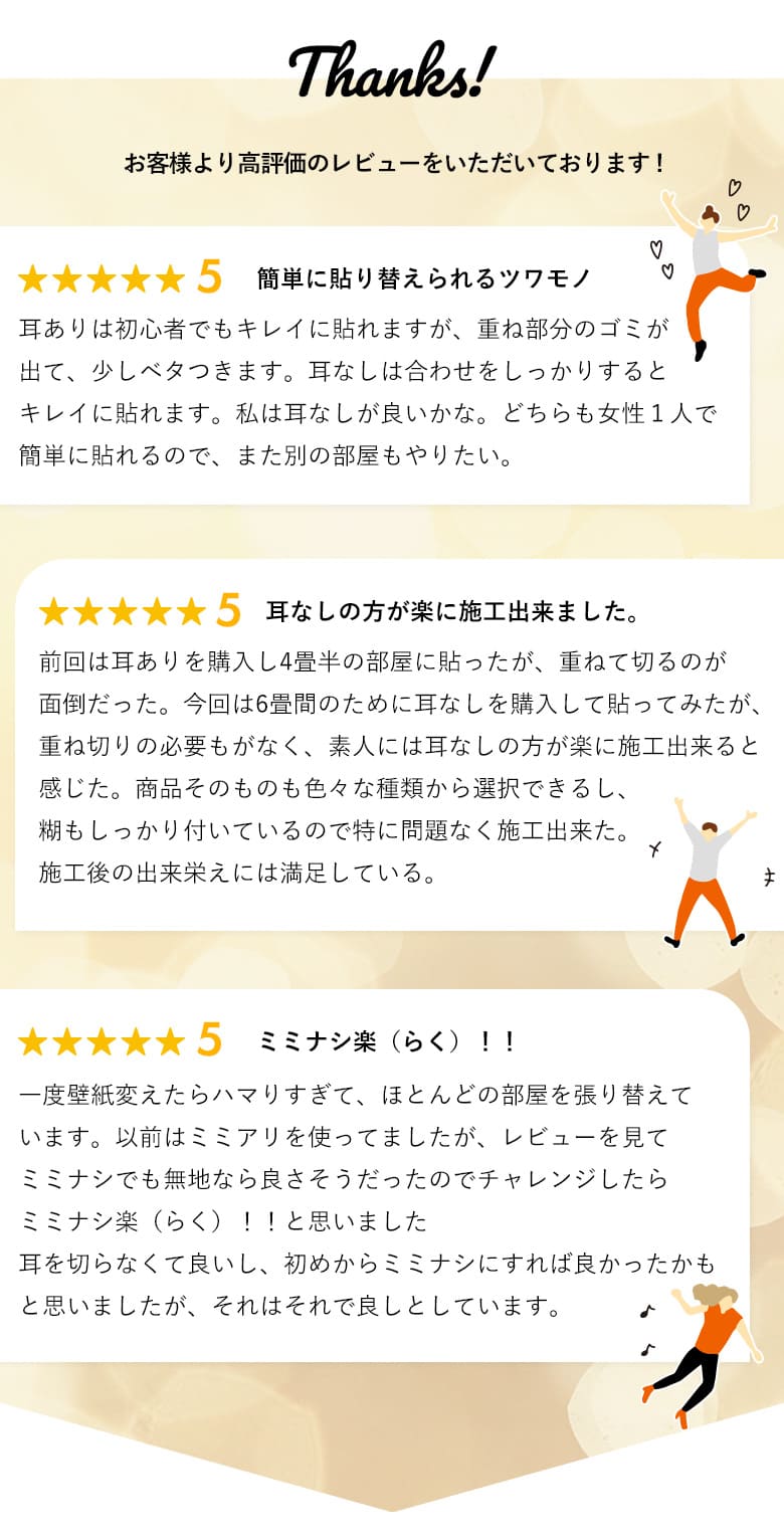 - スリット壁紙(ミミなし)なので、重ね切り不要でぴったりと突き合わせるだけ。初心者でも簡単、スピーディーに貼り替えができます。