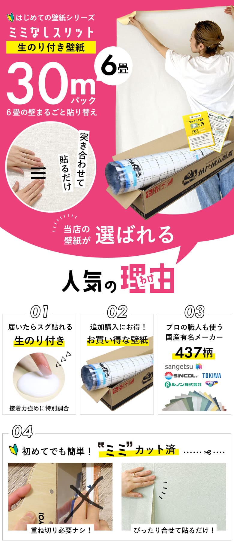 スリット壁紙 ミミなし 生のり付き壁紙 30 mパック+施工説明書