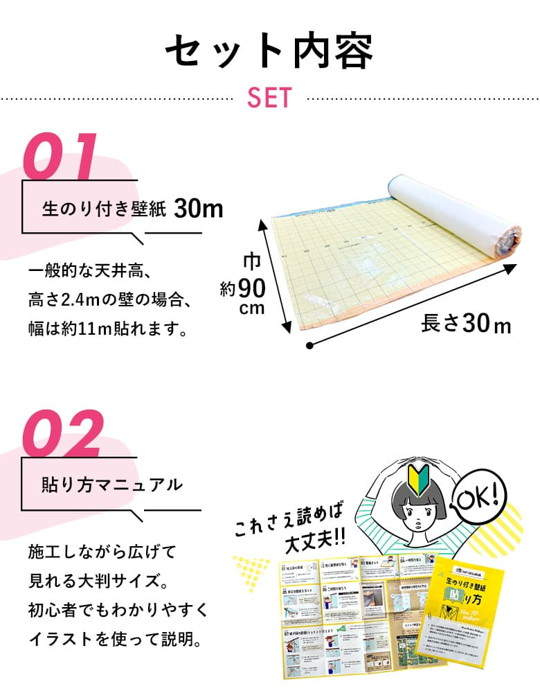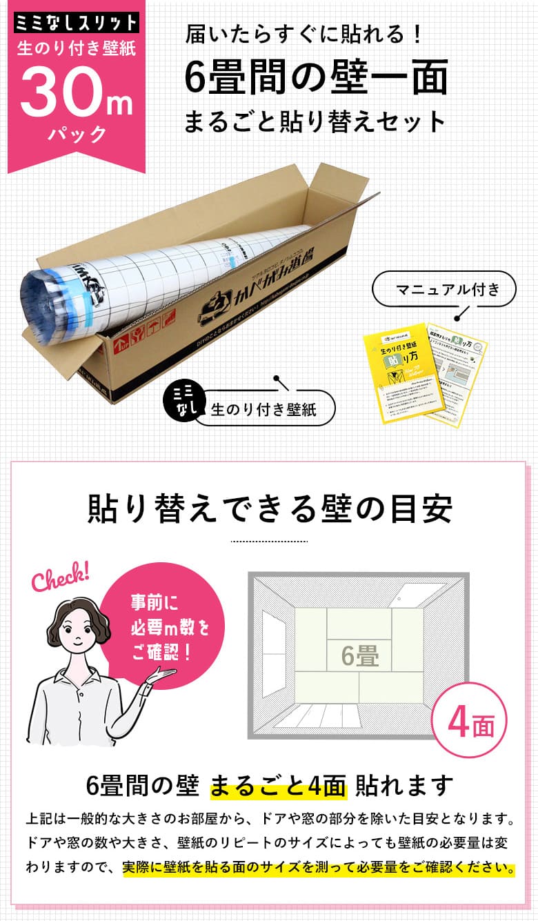 - ・生のり付き壁紙30m(約6畳間の壁分)※スリット壁紙(幅:約90cm)