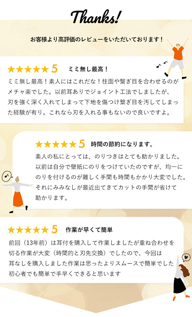 - スリット壁紙(ミミなし)なので、重ね切り不要でぴったりと突き合わせるだけ。初心者でも簡単、スピーディーに貼り替えができます。