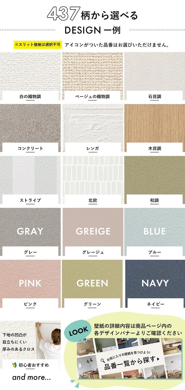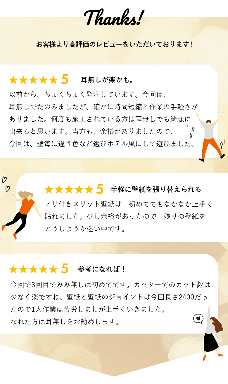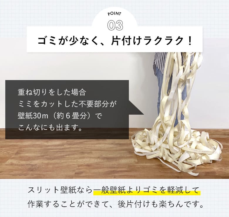 - スリット壁紙(ミミなし)なので、重ね切り不要でぴったりと突き合わせるだけ。初心者でも簡単、スピーディーに貼り替えができます。