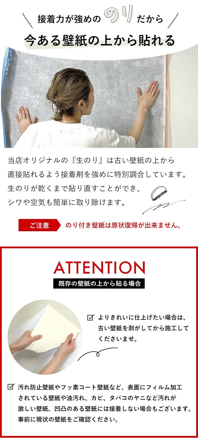 注)汚れ防止壁紙など表面にフィルム加工されている壁紙や、汚れが激しい壁紙の上には接着しない場合もございます。
