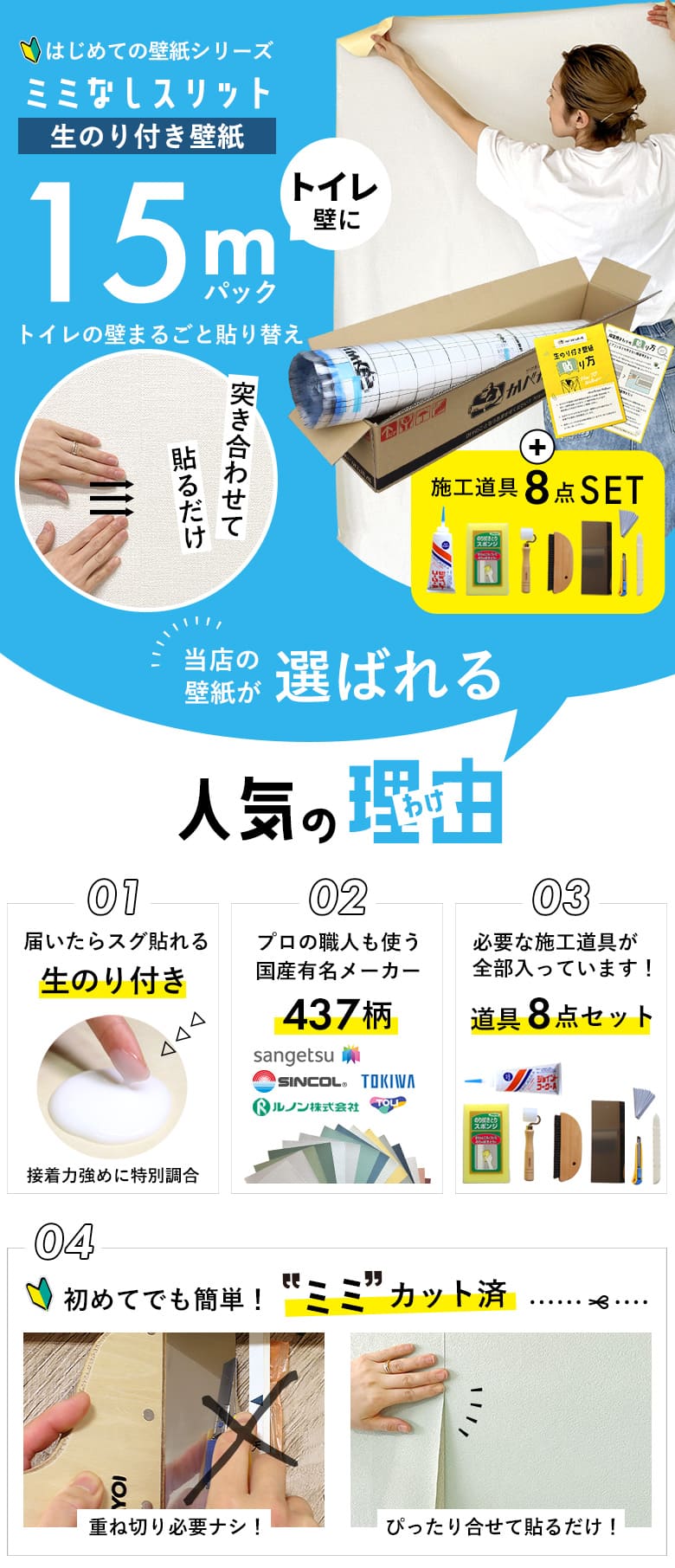 - 壁紙 のりつき 「 スリット壁紙 ミミなし 」 はじめての壁紙30m道具セット 選べる437柄 のり付き壁紙15m+施工道具8点セット+マニュアル