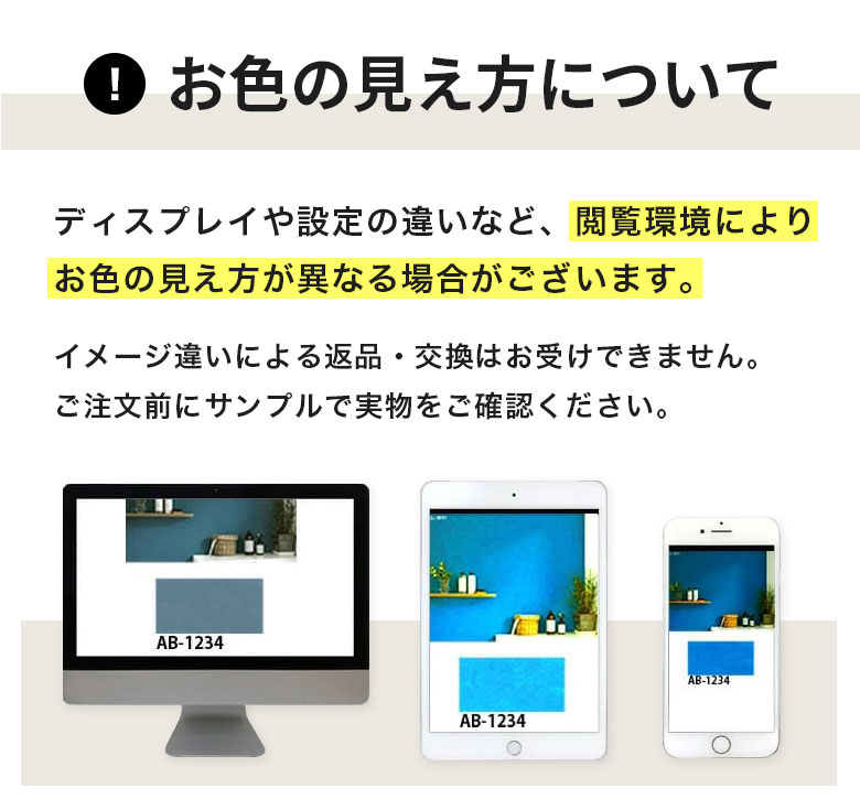 商品の色やイメージ違いによる返品や交換もお受けできませんので、 実物のカットサンプルで実際の色や質感をお確かめいただくことをお勧めいたします。