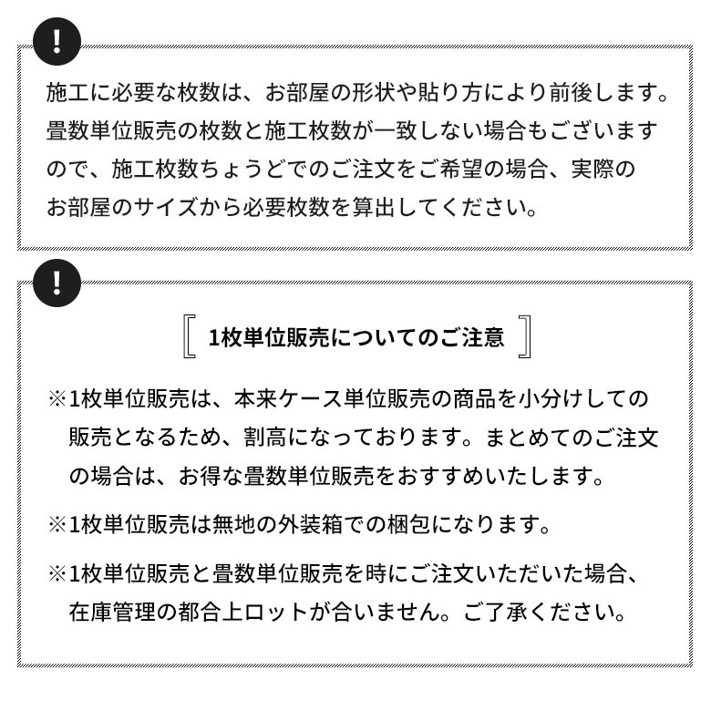 【ご注文単位】サンプル:1枚 / 1枚単位:1枚 / 約1畳分:12枚 / 約2畳分:24枚(1ケース) / 約4.5畳分:54枚(2ケース+6枚) / 約6畳分:72枚(3ケース) / 約8畳分:96枚(4ケース) / 約10畳分:120枚(5ケース) / 約12畳分:144枚(6ケース) / 約18畳分:216枚(9ケース)