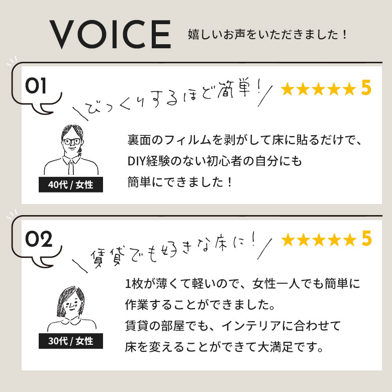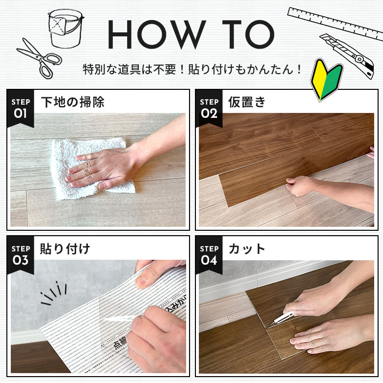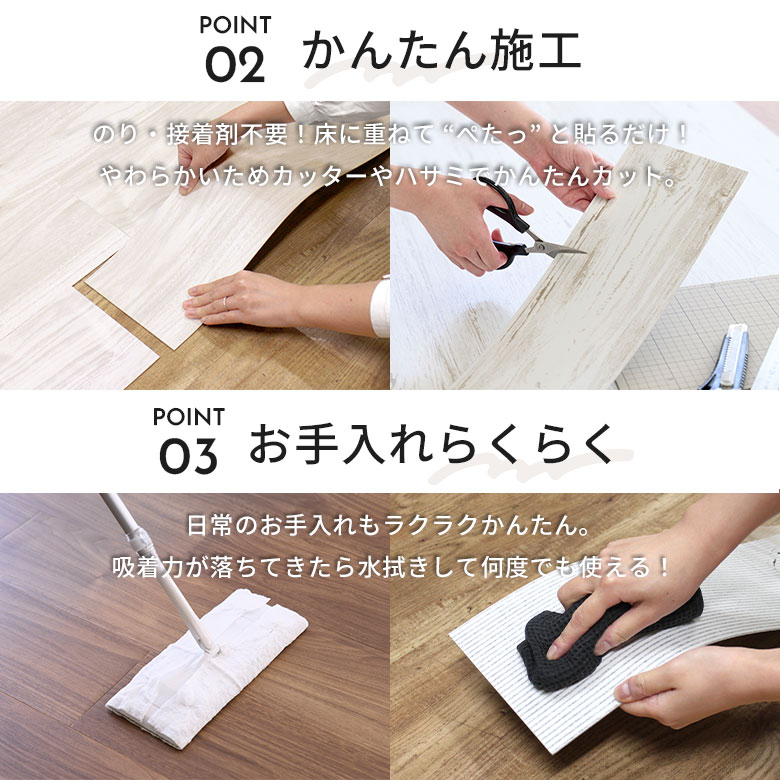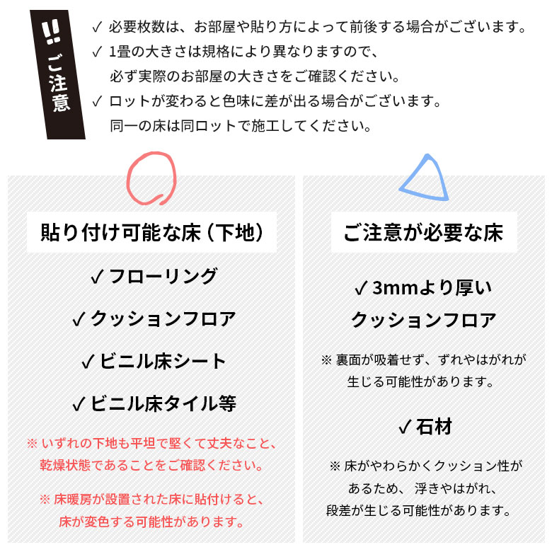 ・下地の床が3mmより厚いクッションフロアや石材の場合、浮きや剥がれが生じたり、裏面が吸着しない場合があります。