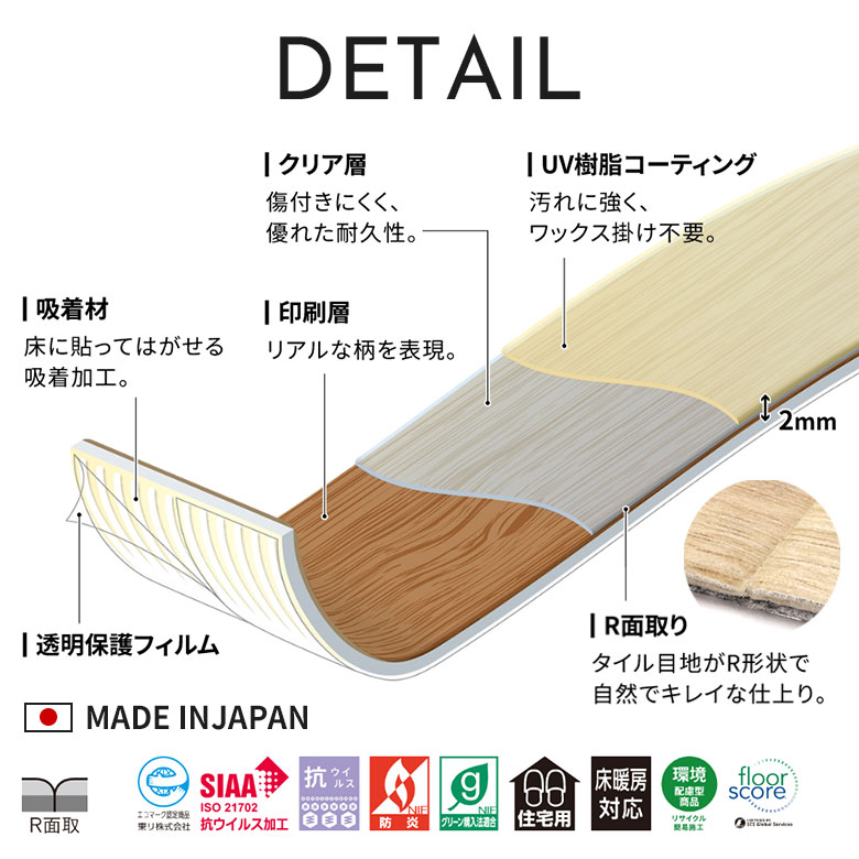 ・表面のUV樹脂コーティングにより汚れに強く、ワックスがけも必要ありません。