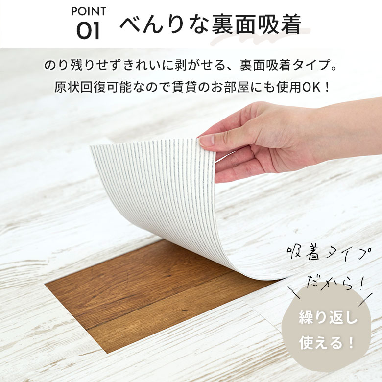 - ・裏面吸着加工なので接着剤不要です。貼り付けるだけでピッタリ床に吸着します。
