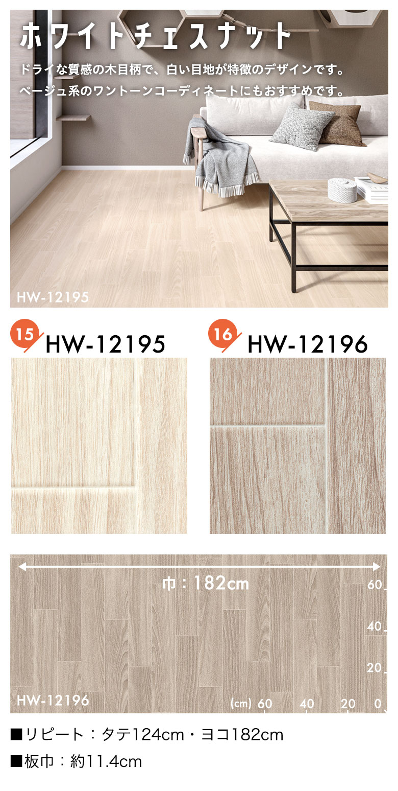 【ホワイトチェスナット】ドライな質感の木目柄で、白い目地が特徴のデザインです。ベージュ系のワントーンコーディネートにもおすすめです。